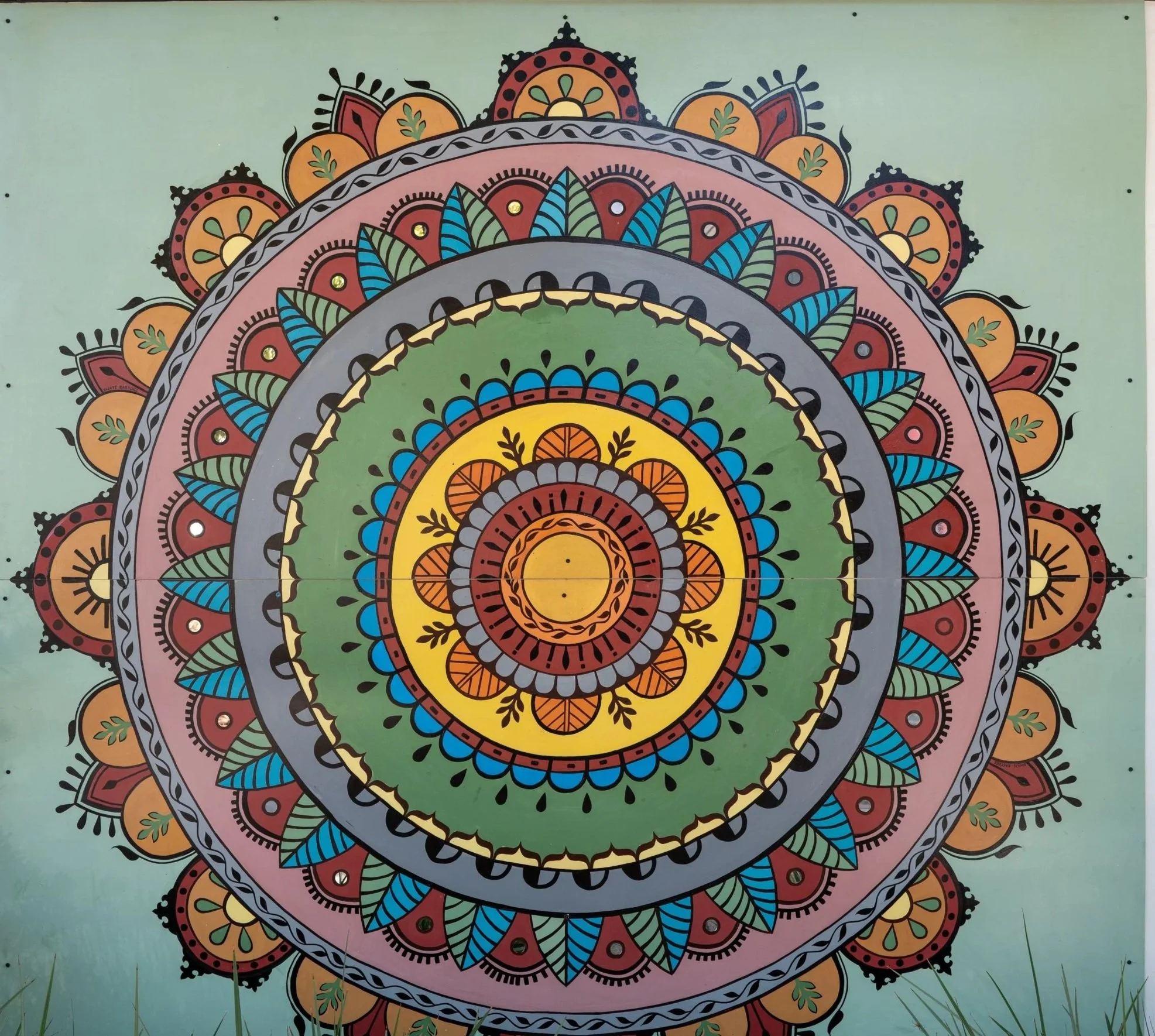 Rastogi’s art has been highly influenced by the tribal and folk arts of her native India. Her art ranges from wall murals, to large and small mandala canvases, chalk mandalas on pavement, henna decorations on skin, smaller craft projects and to food art. Rastogi’s art is elegant, boldly colored and enhanced by fine detail. She is particularly drawn to the mandala which she sees as a motif of completeness and integrity. She begins the design with a central circle which radiates out to bigger and fuller patterns.