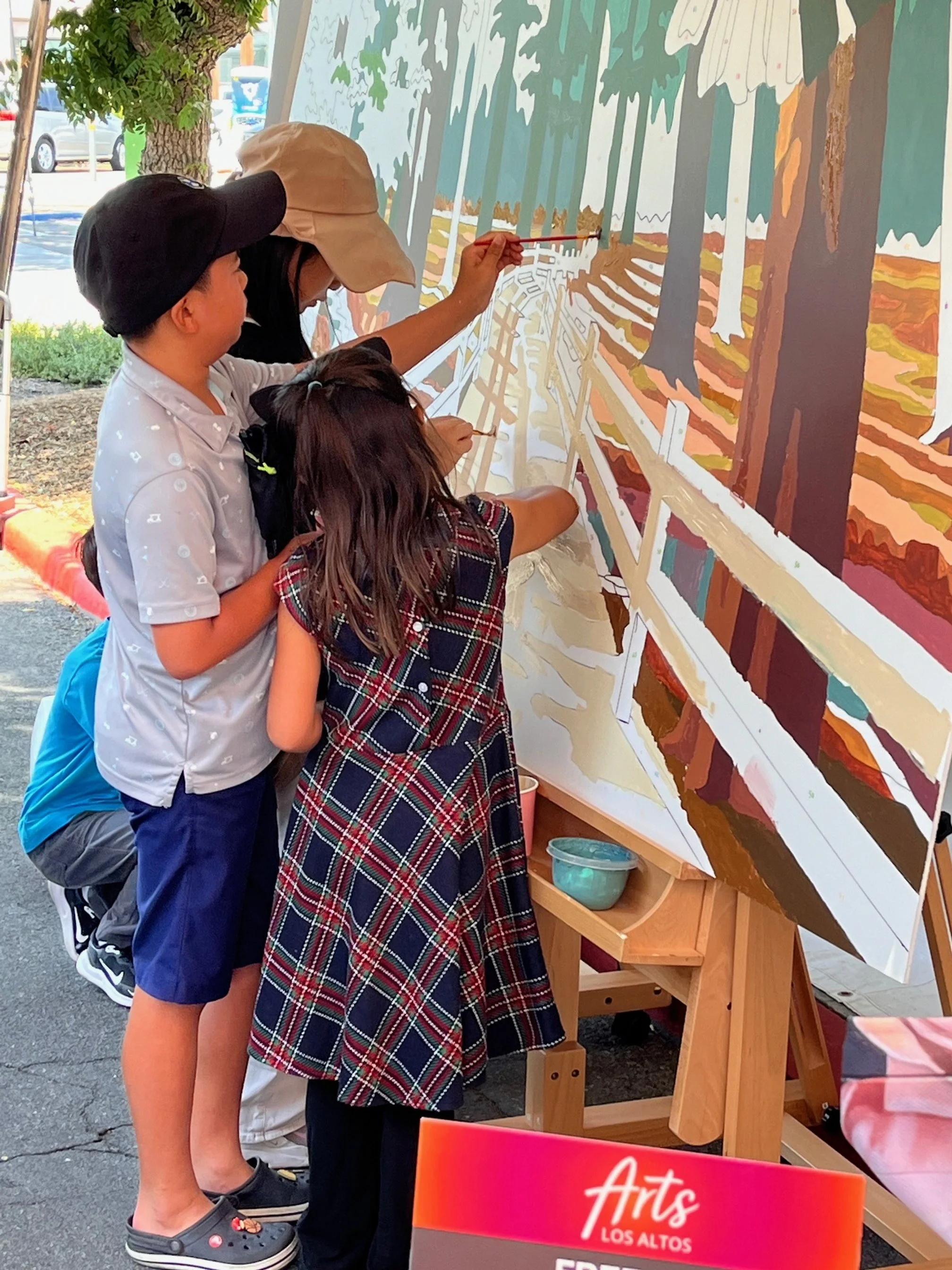 Arts Los Altos hosted an art activity at the 45th Los Altos Arts & Wine Festival, organized in collaboration with the Los Altos Village Association (LAVA), on the weekend of July 13th, 2024. Two 4’ x 8’ panels were painted by many community members and attendees at the festival. The design, by Jorge Juarez from Koichi Arts, represents a child’s view of Redwood Grove, a beloved municipal park along Adobe Creek in Los Altos.